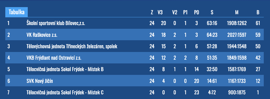 94 8. 2. 2026, 14:00 TJ Sokol Frýdek - Místek B - VK Raškovice z.s. .3:2 (-20,-24,18,24,6)