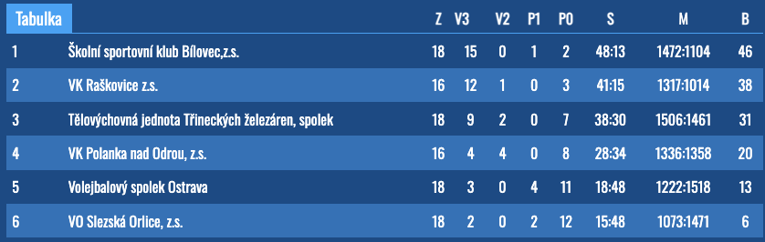 21 22. 3. 2026, 10:00 VK Raškovice - Volejbal Ostrava A 3:0 (13,16,23)