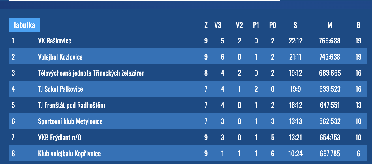 14 26. 11. 2025, 18:30 Volejbal Kozlovice - SK Metylovice 3:1 (16,19,-18,14)